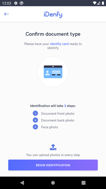 IDenfy Identity Verification ist für Android 9.0 oder höher verfügbar. Die aktuelle Version des Programms ist 2.45, und Sie können es nur auf Englisch ausführen.